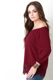 This trendy off the shoulder top features an elastic neckline, woven fabrication, long sleeves, elastic cuffs, and an ornate lace trim hem. Accessories sold separately. Made in U.S.A. 100% Polyester.