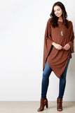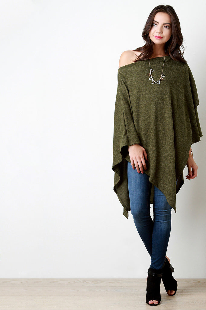 This trendy top features a loose knit fabrication, boat neckline with one shoulder pleating, wrap-around construction, and asymmetrical hemline. Accessories sold separately. Made in U.S.A. 70% Rayon, 26% Polyester, 4% Spandex.