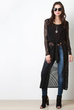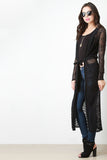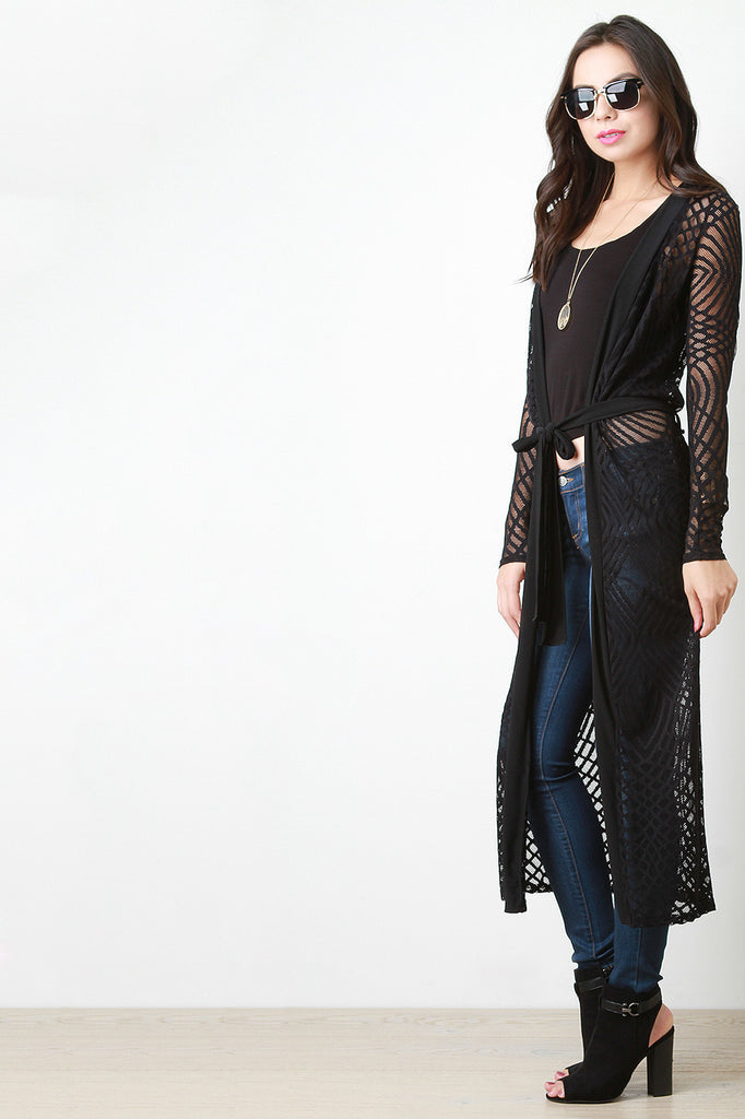 This edgy longline cardigan features semi-sheer mesh, webbed design, open front, long sleeves, and self-tie belt. Accessories sold separately. Made in USA. 90% Nylon, 10% Spandex.