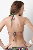 Stand out this summer with the Sparkled Beauty Bikini Top. This triangle bikini top features a metallic polka dot print throughout, full bust padding, and self-tie halter straps at nape and back. Fully lined. 80% Nylon, 20% Spandex. 100% Polyester Lining.