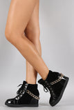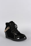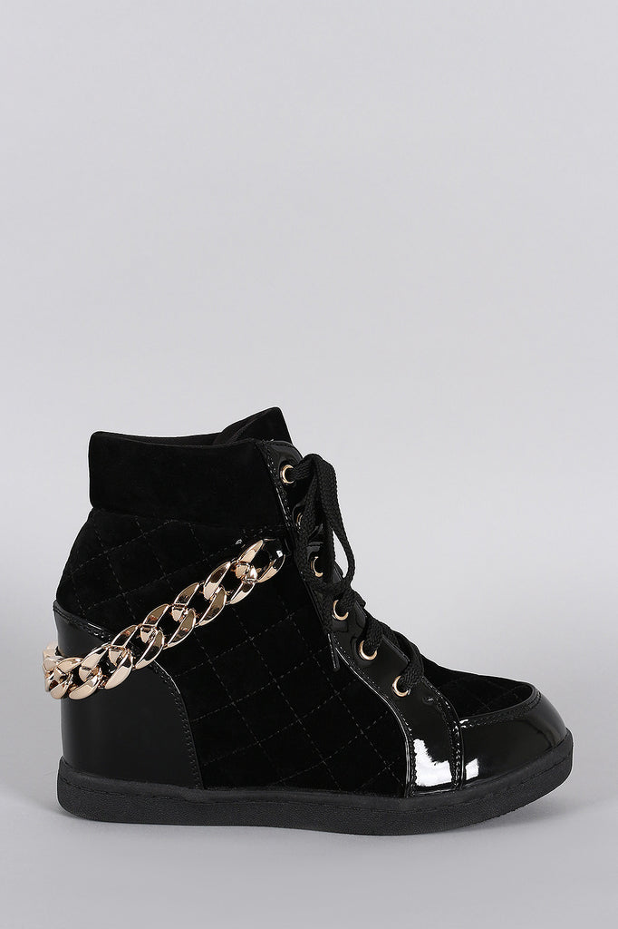This designer inspired sneaker features a covered wedge heel, cushioned high top, and a combination of patent and quilted design. Finished with a gold metallic chain across the rear and lace up closure.