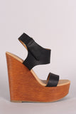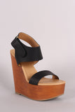 This open toe platform wedge features a single strap across vamp, chunky faux wooden platform, wedge heel, and lightly padded insole. Adjustable ankle strap with hook and loop closure.