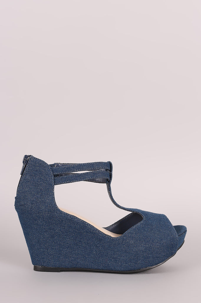 This lovely peep toe wedge features a denim throughout, T-strap design, double ankle strap with partial elastic insert, covered platform, and wedge heel. Finished with a lightly padded insole and rear zipper closure for easy on/off.
