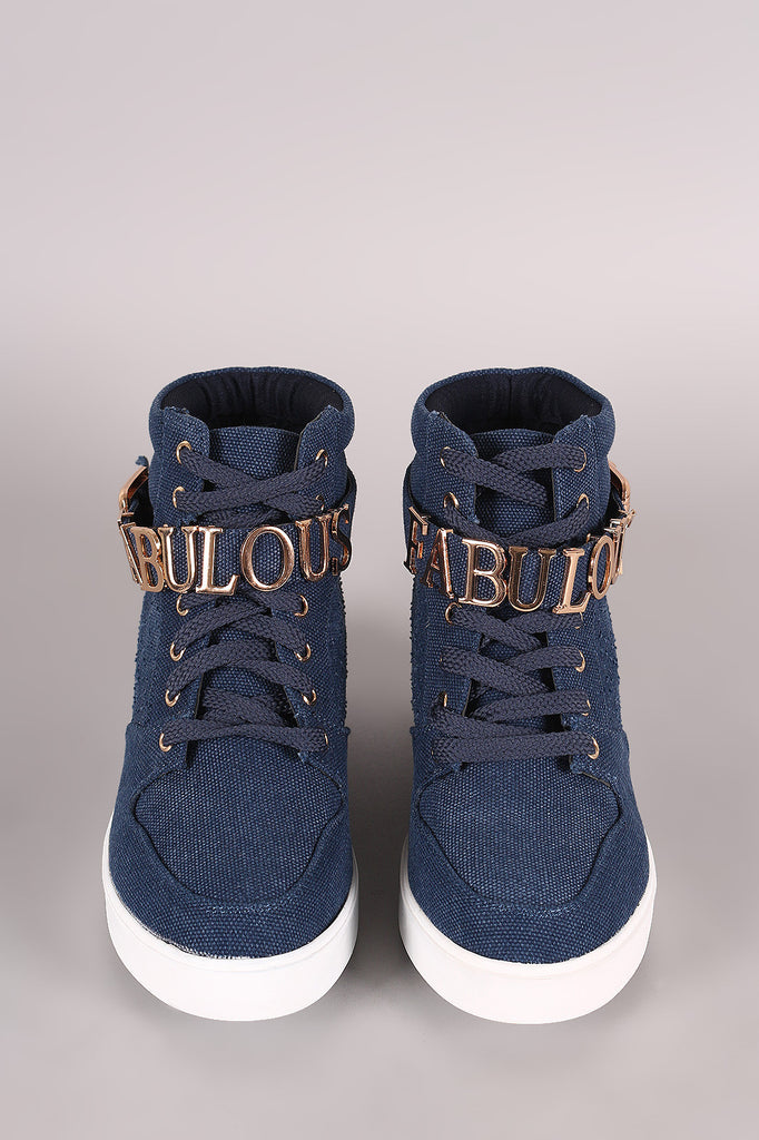 This high top wedge sneaker features a rounded toe, perforated design, side buckle accents, and decorative ankle strap with the word "FABULOUS" inserted. Finished with a hidden wedge heel, cushioned insole, padded collar/tongue, and lace up closure.
