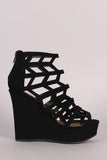 These wedges are elevated on a platform, featuring a cutout cage with an adjustable rear back zipper. Peep toe.
