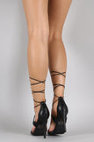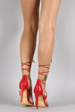 self-tie lace up construction, and enclosed back with wrapped stiletto heel. Finished with lightly padded insole.