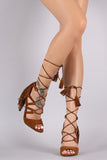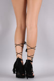 This suede peep toe lace up tie for secure closure, featuring an adjustable rear back zipper and fringe tassel ends.
