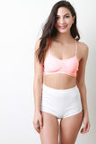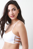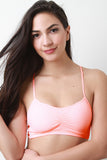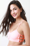 This bralette features textured stretch knit, padded bust, ruche detail, strappy sides, and racer back. Accessories sold separately. 92% Nylon, 8% Spandex.