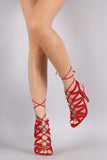 This stunning lace up closure, peep toe silhouette, wrapped stiletto heel, and lightly padded insole for comfort.