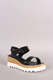 This lug sole , and faux wooden flatform heel. Finished with an adjustable hook and loop ankle strap closure.