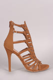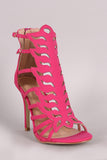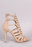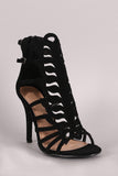 This eye-catching heel features a cage style peep toe silhoutte, unique cutout design, and wrapped stiletto heel. Finished with low platform, lightly padded insole for comfort and back-zip closure.