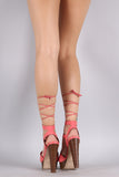 This stunning lace up closure, peep toe silhouette, tribute platform, chunky stacked heel, and lightly padded insole for comfort.