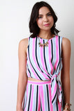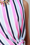 This sleeveless crop top features a high scoop neck, binding on the collar and am holes, asymmetrical tie hem, lining, an invisible side zipper, and a button at nape. Accessories sold separately. Shell 52% Rayon, 48% viscose. Lining 100% Polyester.