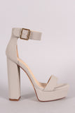 This elevated open toe heel is on a square platform and chunky heel. Features classic ankle strap with an adjustable buckle.