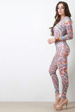 This jumpsuit features abstract floral medallion print on semi-sheer mesh fabrication, round neckline, long sleeves, keyhole back, and a single button closure at nape. Accessories sold separately. Made in U.S.A. 95% Rayon, 5% Spandex.