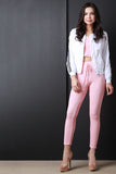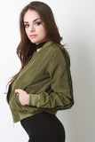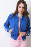 This bomber style jacket features zip-up front, rib knit trim, double striped sleeves, two snap button pockets, and finished with lining. Accessories sold separately. 100% Polyester.