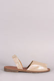 This flat sandal features sparkling iridescent glitter fabric upper, open toe silhoutte, and slip-on with slingback closure.