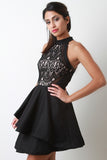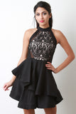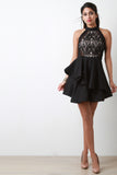 Semi-Sheer Lace Mock Neck Asymmetrical Ruffled Mini Dress