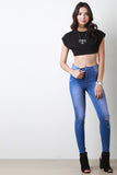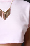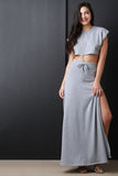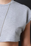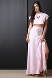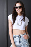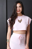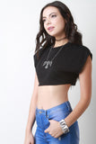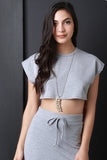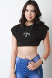 This crop top features soft jersey knit, round neckline, and cap sleeves. Accessories sold separately. Made in U.S.A. 87% Polyester, 10% Rayon, 3% Spandex.