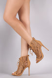 These fashion-forward heels feature a peep toe silhouette, geometric cutout design vamp with lacing detail, and wrapped stiletto heel. Finished with lightly padded insole and rear zipper closure for easy on/off.