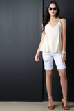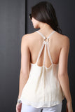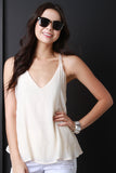 This cute sleeveless top features a strappy low cut back design, lace spaghetti straps, v neckline, flare cut, knit lining, light weight woven fabrication. Accessories sold separately. Made in U.S.A. Shell: 60% Rayon 40% Polyester. Lining: 100% Polyester