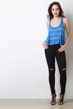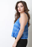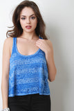 This crop top features a knit fabrication, burn out detail, stripe pattern, scoop neckline, racer-back style, relaxed fit, triangle side inserts, finished with raw edges. Accessories sold separately. Made in U.S.A. 50% Cotton, 47% Polyester, 3% Rayon.