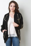 This longline jacket features thick knit, rib knit trim, zip-up front, chain accents throughout, and two pockets. Accessories sold separately. 65% Cotton, 35% Polyester.