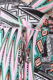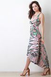 This wrap style maxi dress features abstract print, deep v surplice neckline, overlapping front, self-tie waist string, and slight high-low hemline. Accessories sold separately. Made in USA. 92% Polyester, 8% Spandex.