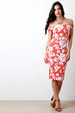 This midi dress features a textured stretchy knit fabrication, abstract floral print, off the shoulder neckline with banded sleeves and back bottom center slit. Accessories sold separately. Made in U.S.A. 96% Polyester, 4% Spandex.