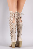 These fashionable over-the-knee boots feature a diamond cutout design, peep toe silhouette, chunky stacked heel, and cushioned insole for comfort. Finished with back zipper and partial lace-up closure.