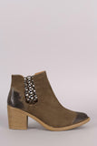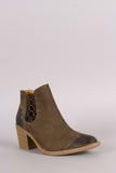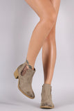 These western inspired cowgirl booties feature an almond toe silhouette, distressed vegan suede with elasticized woven design, and chunky stacked heel. Finished with a cushioned insole, smooth lining, and easy pull-on construction.