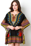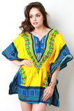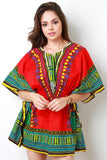 This festive dress features a woven fabrication, African Dashiki print pattern, smocked waist, and wide sleeves. Finished with a mini-length hemline. Accessories sold separately.