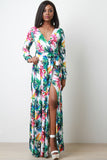 Abstract Floral Surplice V-Neck Waist Tie Long Sleeves Maxi Dress