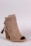 These trendy booties features a vegan suede fabrication, peep toe silhouette, wrapped strap detail with a tassel finish and chunky stacked heel. Finished with a cushioned insole and side zipper closure for easy on/off.