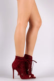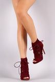 This trendy heel features an overlapping perforated vegan suede upper with lace-up vamp closure, peep toe silhouette, and wrapped stiletto heel. Finished with a light padded insole for comfort.