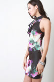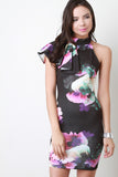 This sleeveless bodycon dress features an asymmetrical design, ruffle side collar on mock neckline, double button closure at nape, sculpture fit, mini length hemline, and floral print. Accessories sold separately. Made in U.S.A. 93% Polyester, 7% Spandex.