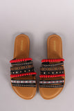 This flat sandal is slide silhouette, featuring a strappy vamp. The straps feature embroidery, pom poms, and studs.