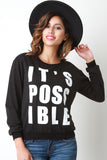 This sweater top features a round neckline, long sleeves, and a contrasting screen print "It's Possible" at front. Made in U.S.A. 97% Polyester, 10% Rayon. Contrast: 96% Rayon, 4% Spandex.