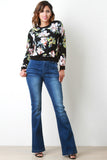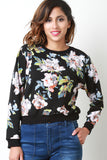 This sweater top features a round ribbed neckline, long sleeves, and floral pattern print on texture knit fabrication. Made in U.S.A. 95% Polyester, 5% Spandex. Contrast: 96% Rayon, 4% Spandex.