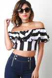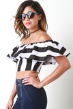 This beautifully bold top features wide contrasting stripes, elasticized off the shoulder neckline, flutter tier, and a crop hemline. Accessory sold separately. Made in U.S.A. 95% Polyester, 5% Spandex.