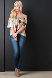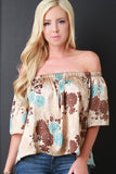 This trendy top features a floral printed satin fabrication, elasticized off the shoulder neckline, short sleeves, and high-low hemline. Accessories sold separately. 100% Polyester.