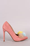 These fun heels feature 3 colorful fur pom poms on the toe, vegan suede fabrication, pointed toe silhouette, wrapped stiletto heel, and a lightly padded insole for comfort.