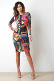 This bodycon dress features a thin knit fabrication, abstract artistic print, long sleeves, rounded neckline, curve hugging fit, and a knee length hem. Made in U.S.A. 95% Polyester 5% Spandex.